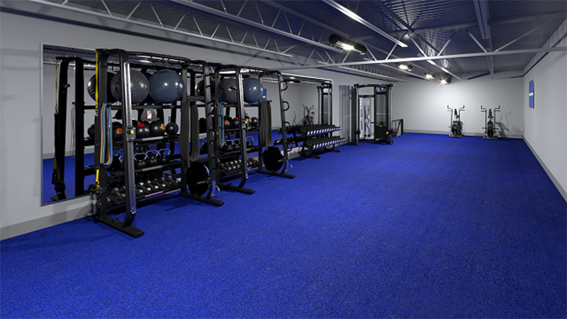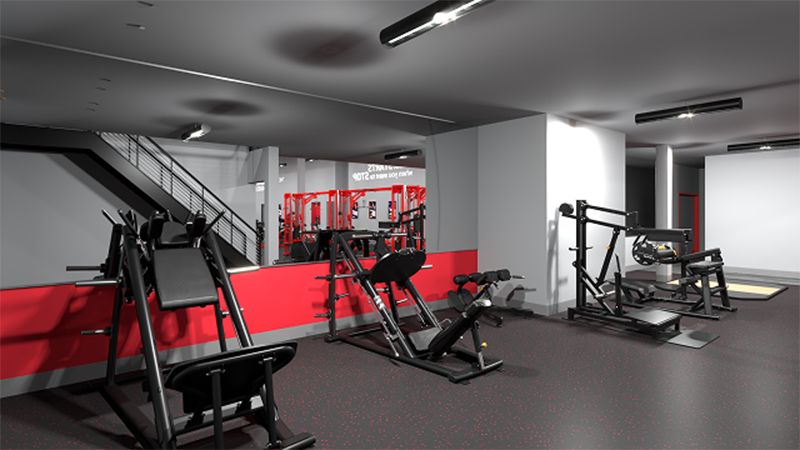 Dedicated plate weight area, featuring free weight dumbbells, squat rack, flat and incline bench press, smith machine, and a variety of assisted weight lifting equipment