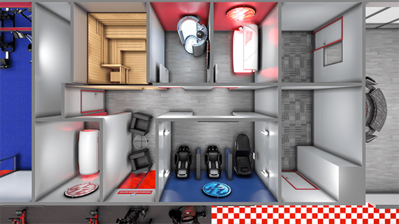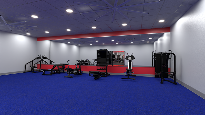 Dedicated plate weight area, featuring free weight dumbbells, squat rack, flat and incline bench press, smith machine, and a variety of assisted weight lifting equipment